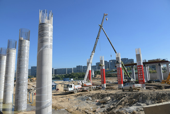 富足山舊橋位于城區(qū)文峰路上,全長300米、寬18米、高19米,運(yùn)行30年,是常山縣33.6萬人出行,與杭州、江西上饒等地密切聯(lián)系的重要通道,被當(dāng)?shù)厝朔Q為民生橋。新建富足山大橋在舊橋原址上,與天馬樞紐泄洪閘相距約30米,橋墩和橋面橫跨導(dǎo)流墻。該橋全長376.8米、11垮、高19米、寬27.5米,直徑1.5—1.8米的樁基46根,直徑1.7米的墩柱42個(gè),9、10垮為通航通道,上部為T梁結(jié)構(gòu),橋面兩側(cè)各增加2.75米寬的人行道和3米寬的非機(jī)動(dòng)車道。2024年11月開工建設(shè)。該項(xiàng)目在樁基施工中,利用冬春雨水少的特點(diǎn),從兩端向中間推進(jìn),為橋墩施工創(chuàng)造了條件。今年汛期過后,項(xiàng)目部建起一座100多米長的漫水橋,右側(cè)5排20根墩柱和蓋梁完成后,填筑起一座6米多高的圍堰,將常山江水改變流向,從完工的墩柱位置流過,抽干左側(cè)河道的積水,組織人力和機(jī)械進(jìn)行樁基施工。在墩柱施工中,采取在破樁頭后的樁基上綁扎鋼筋籠、安裝定型鋼模、一次性灌注的辦法,使拆模后的墩身顏色一致、光潔如玉,受到業(yè)主、監(jiān)理單位的好評。