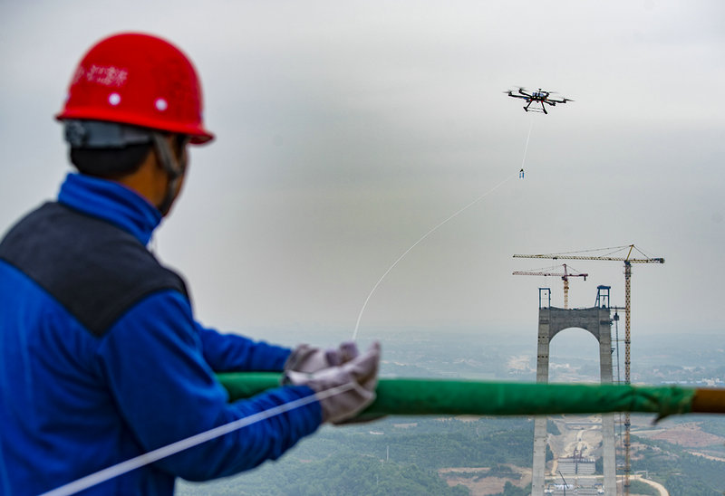 此次先導(dǎo)索采用直徑2.0毫米、長1760米的高強(qiáng)度高韌性杜邦絲,由GPS自控導(dǎo)航式無人機(jī)攜帶,待起飛指令發(fā)出后,“飛手”操控?zé)o人機(jī)從南索塔156米高的塔頂起飛,飛躍1038米寬的長江,歷經(jīng)5分鐘,飛至北索塔148米的主塔塔頂,成功連接長江兩岸。先導(dǎo)索過江完成后,將以此索為基礎(chǔ),采用“小繩拉大繩”方式,通過來回8次拖拽,逐漸增加鋼繩重量,形成貓道主牽引系統(tǒng),最后進(jìn)行貓道的安裝與主纜索股架設(shè)施工。