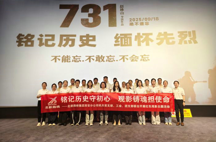 銘記歷史,緬懷先烈。9月26日,北新路橋集團西安分公司機關黨支部、工會小組、團支部聯(lián)合開展“銘記歷史守初心 觀影鑄魂擔使命”主題觀影活動,集中觀看重大革命歷史題材電影《731》。