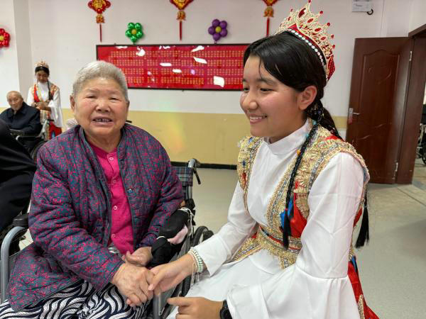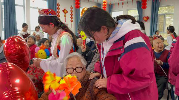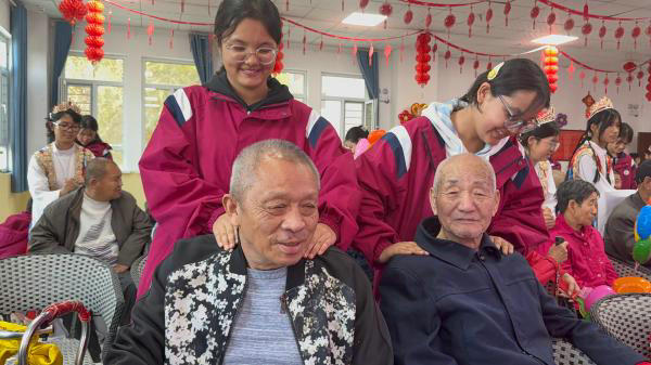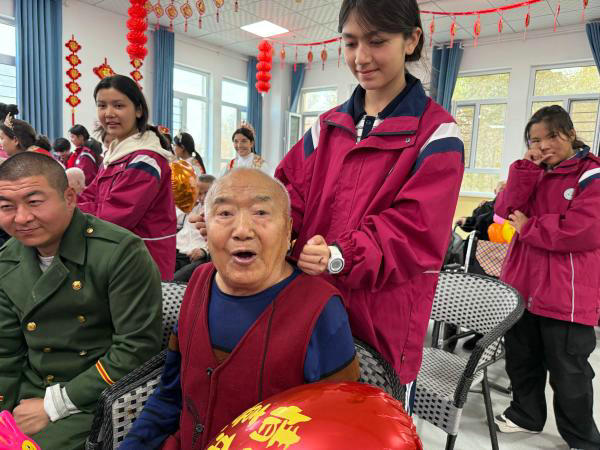 在親切的嘮家常環(huán)節(jié),學生們圍坐在長者身旁,傾聽他們講述過去的故事,分享生活中的趣事。一張張笑臉、一聲聲問候,讓整個養(yǎng)老院都沉浸在溫馨和睦的氛圍里,也讓長者們在重陽佳節(jié)感受到了如同家人般的陪伴與關愛。
