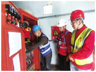 兵團(tuán)建工水電集團(tuán)建業(yè)公司承建的兵團(tuán)二中多功能教育中心建設(shè)項(xiàng)目現(xiàn)場,項(xiàng)目總工和安全部長對總配電室的配電柜進(jìn)行檢查(劉耿拍攝)