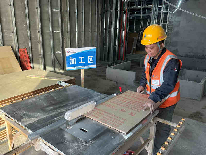 和粉塵,既影響施工人員呼吸健康,又散落覆蓋設備與地面,導致現(xiàn)場臟亂、清理耗時,更因木屑易燃多次被列為消防隱患。為從源頭解決問題,該項目部團隊立足實際需求,巧妙加裝鋸末回收吸塵裝置,結合設備結構實際,創(chuàng)新將吸塵點設置在臺鋸下方,鋸片工作區(qū)域的底部出料口處是鋸末拋出的主要通道,通過在臺鋸底座加裝金屬導流槽,將切割產(chǎn)生的碎屑直接導入下方連接的耐磨橡膠管道,再由工業(yè)吸塵器負壓抽吸至防靜電集塵袋中,實現(xiàn)“切在哪,吸在哪”的高效回收。而上方則保留原有鋸片防護罩,兼具安全防護與防塵隔離功能,避免操作人員受到機械傷害,同時減少粉塵向上擴散。“現(xiàn)在切板子灰塵少,眼睛不刺撓,地上也干凈。”現(xiàn)場的木工師傅說道。該裝置不僅改善了木工作業(yè)區(qū)環(huán)境,更體現(xiàn)了項目團隊從細節(jié)處求突破的精益管理思路。下一步,該事業(yè)部將持續(xù)鼓勵一線人員立足現(xiàn)場,以更多“巧思”推動施工管理提質(zhì)增效。