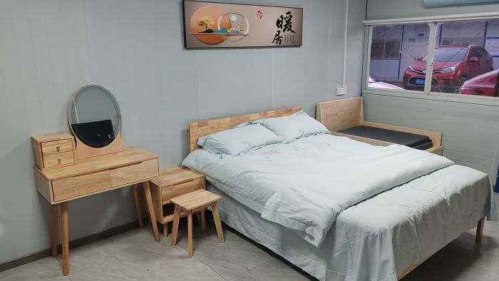 在硬件配置上,堅(jiān)持“精益求精”原則,所有設(shè)施均經(jīng)過多方對(duì)比、優(yōu)中選優(yōu)。家具采用環(huán)保材料,衣柜配備掛桿與抽屜,滿足衣物分類收納需求;每間小屋加裝空調(diào)、床頭USB充電接口,并配備應(yīng)急藥品包。室內(nèi)大床、兒童床、冰箱、電視機(jī)等生活設(shè)施一應(yīng)俱全,窗簾、床單、被褥等用品搭配齊全,掃帚、簸箕等清潔工具也同步配備。