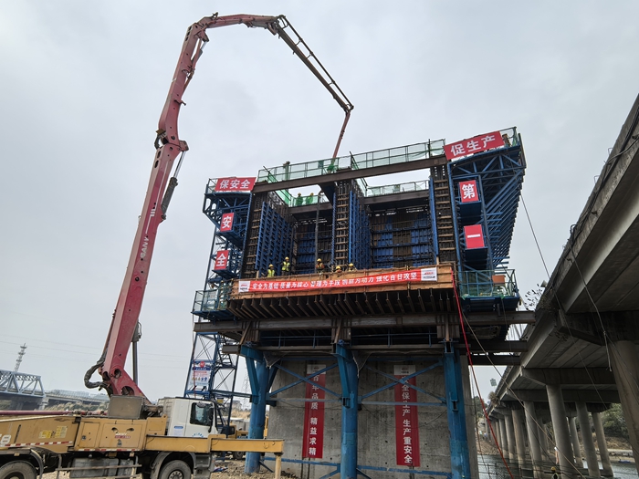 徐村大橋(80+140+80m)單箱雙室連續(xù)梁在全國同類型公路橋梁中排名前十,結(jié)構(gòu)尺寸大,工藝復(fù)雜。為確保施工安全,項(xiàng)目部技術(shù)團(tuán)隊(duì)優(yōu)化支撐結(jié)構(gòu),降低鋼管柱直徑,0#塊采用了體內(nèi)+體外雙固結(jié)體系。為了確保施工便捷和安全,該項(xiàng)目加工制作了從地面直達(dá)0號(hào)塊頂端的一個(gè)鋼結(jié)構(gòu)、可同時(shí)承重15人的梯籠供員工上下使用。在混凝土澆注時(shí),主管領(lǐng)導(dǎo)、總工、安全總監(jiān)全程督導(dǎo),觀察混凝土泵車的灌注、振搗工振搗混凝土密實(shí)度、作業(yè)工人安全防護(hù)等情況,發(fā)下按任何不利于施工質(zhì)量和安全的因素立即叫停整改,為0號(hào)塊施工打造良好的環(huán)境。