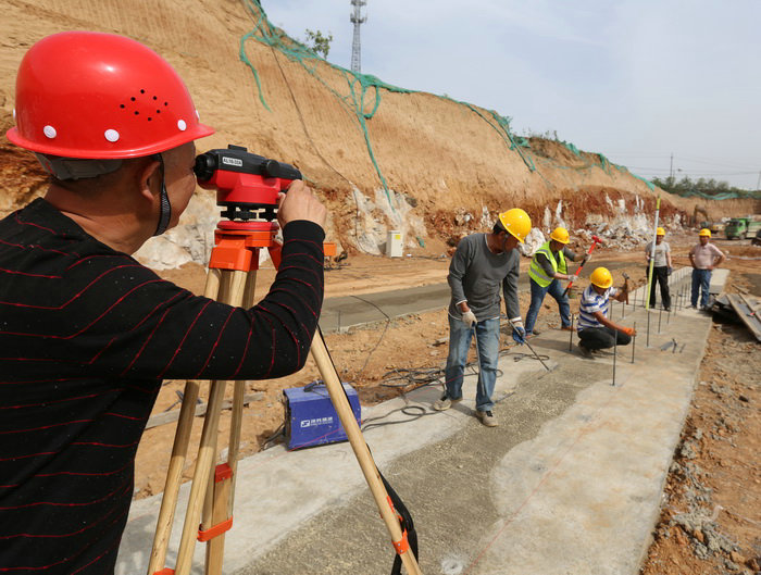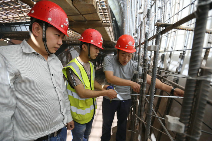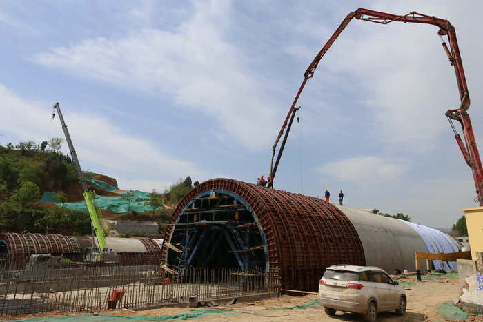 工區(qū)長汪衛(wèi)(左一)、技術(shù)主管王凱崗(右一)檢查隧道邊墻鋼筋間距三工區(qū)管段4公里多,有挖方92萬方,填方98萬方。其中,高填方段總長1.7公里,共設(shè)7座拱涵,跨徑分別為6米和11米,拱涵采用襯砌臺車施工,跨徑11米的拱涵凈空尺寸與高速公路隧道一般大小,為河南省最大跨徑的拱涵。項(xiàng)目總工張寶軍介紹:“這段高填方路基原設(shè)計(jì)為橋梁,因該段位于煤礦采空區(qū),地質(zhì)不穩(wěn),后變更為填方路基。”項(xiàng)目部工程部長周鵬說:“業(yè)主要求6月底完成路基填筑,由于拱涵施工工序復(fù)雜,澆筑一板9米,5天一個循環(huán),最短的也要45天才能完工。”項(xiàng)目部班子成員與總監(jiān)徐艷軍、駐地吳兆華到現(xiàn)場辦公,將從這里通過的縣道034線,改到路基挖方段通過,改道長度600米,按縣道標(biāo)準(zhǔn)修建。改道后,完工的涵洞就可以及時(shí)填筑路基。