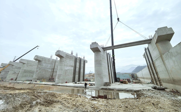 鐵路工程建設(shè)網(wǎng)訊 1月26日上午,錢塘江新建項(xiàng)目常山江項(xiàng)目天馬樞紐泄洪閘首片梁在500噸大吊車和人力配合下,成功安放在8——9號閘墩上,這是該樞紐泄洪閘首次架梁。