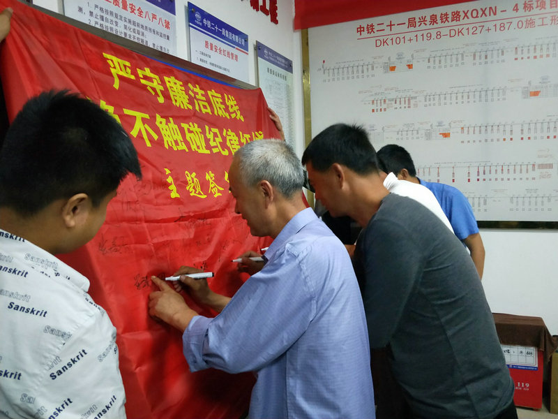項目部全體干部職工在紅幅上簽下自己的名字,這不僅僅是一個名字,而是代表了一份承諾,一份對黨、對自己的承諾!