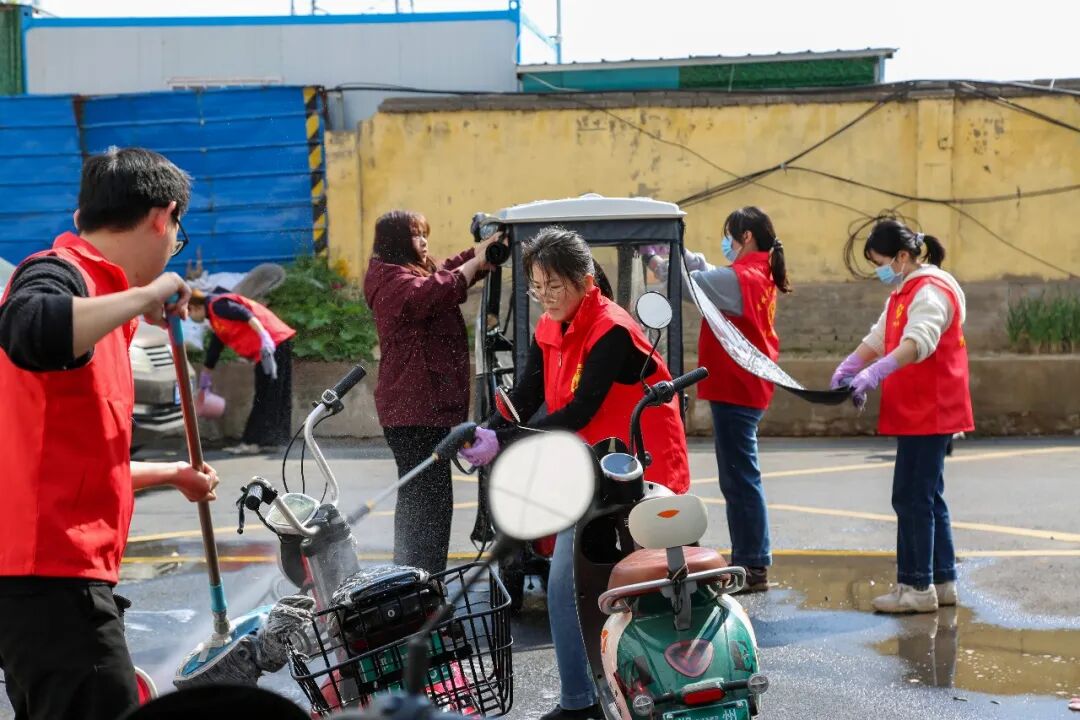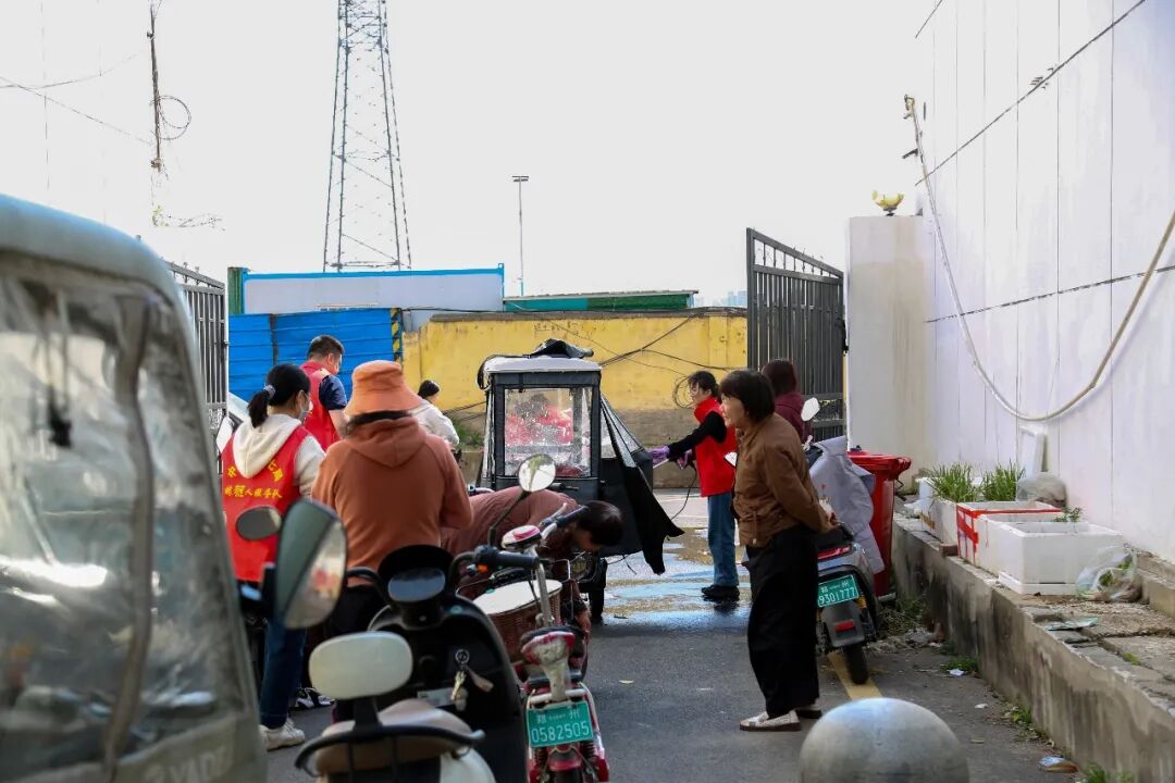 活動現(xiàn)場井然有序、氛圍熱烈,服務隊隊員們分成兩支小隊同步開展服務。第一分隊在小區(qū)東側通道服務點位,專注為業(yè)主清洗電動車,隊員們分工明確、配合默契,認真沖洗車身污垢、清理縫隙死角、細致擦拭車身,全程耐心引導業(yè)主有序排隊、文明參與。第二分隊聚焦小區(qū)衛(wèi)生整治,重點對小區(qū)下沉景觀、綠化帶、角落盲區(qū)等衛(wèi)生死角進行了清理。
