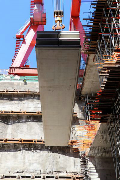 中國(guó)鐵路工程建設(shè)網(wǎng)訊(通訊員 王福生)6月1日,上午6點(diǎn)58分,工區(qū)經(jīng)理蘇曉亮一聲令下,一片長(zhǎng)5米、寬2米、高3.2米,重39.5噸的混凝土預(yù)制件,在龍門(mén)吊司機(jī)的精心操作下,從20多米的上空向基坑緩緩而下,經(jīng)過(guò)18分鐘的平穩(wěn)運(yùn)行,混凝土預(yù)制件B1塊穩(wěn)穩(wěn)當(dāng)當(dāng)?shù)穆渥诰綏l帶上,頓時(shí),鞭炮聲、歡呼聲響成一片。