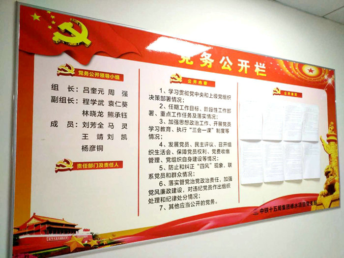 黨務(wù)公開欄修水G353項(xiàng)目2月份開工,工期緊、安全壓力大。黨支部充分發(fā)揮黨建工作優(yōu)勢,引領(lǐng)黨員干部提升履職能力,激發(fā)其內(nèi)在活力、敢于擔(dān)當(dāng)和較強(qiáng)的責(zé)任心,將思想和行動集中到完成工期、安全、質(zhì)量、效益、環(huán)保計劃目標(biāo)上來。黨支部按照公司黨委的工作部署和項(xiàng)目實(shí)際,經(jīng)過反復(fù)醞釀,推出了黨支部工作安排、創(chuàng)建四好班子實(shí)施方案、黨風(fēng)廉政建設(shè)發(fā)腐敗工作要點(diǎn)等多項(xiàng)工作計劃,并有步驟地狠抓落實(shí)。首先在黨員中開展?fàn)巹?chuàng)“紅旗責(zé)任區(qū)”、“黨員先鋒崗”、“黨員之星”活動,要求每個黨員戴黨徽、亮身份、寫承諾,時刻不忘入黨誓詞和履行黨員的義務(wù)。7名黨員在管理、技術(shù)、政工等崗位上身先士卒、勇挑重?fù)?dān),用榜樣的力量帶動職工戰(zhàn)勝隧道塌方等層出不窮的難題。