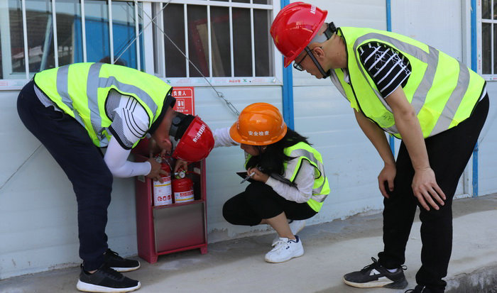 圖為檢查安全防火設(shè)施 與此同時,項目部配合地方政府走上街頭,向群眾發(fā)放傳單,宣講安全常識,每周進行一次例行安全隱患排查,主要對管區(qū)、生活區(qū)滅火器、電源開關(guān)箱、宿舍照明線路、拌合樓樓梯的安全防護等進行隱患排查。項目主管領(lǐng)導抓落實。并逐級簽定安全責任狀,把各種安全規(guī)章制度和措施真正落實到每個節(jié)點上,使之變成參建員工自覺重視安全的行動。安質(zhì)部人員在現(xiàn)場講解安全卡控要點,對安全工作小題大作,把不安全苗頭當做大事抓,使員工牢記“安全無小事”的思想意識,始終繃緊安全生產(chǎn)這根弦。