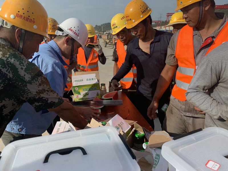 近期,福建地區(qū)連日高溫,驕陽似火,酷暑難耐。在這樣炎熱的環(huán)境下,中鐵建大橋工程局晉江制梁場(chǎng)的現(xiàn)場(chǎng)管理人員以及農(nóng)民工工友們?nèi)詧?jiān)守在施工一線,在自己的崗位上為項(xiàng)目的建設(shè)奮力拼搏。炎炎夏日送清涼,絲絲關(guān)愛入心田,為了讓可愛可敬的農(nóng)民工兄弟們感受到來自企業(yè)的關(guān)懷和問候,6月21日下午,福廈鐵路晉江制梁場(chǎng)積極響應(yīng)公司號(hào)召,組織開展了“炎夏送清涼,關(guān)愛農(nóng)民工”的慰問活動(dòng),發(fā)放西瓜、生津止渴的飲品、常用應(yīng)急藥品等防暑降溫物品。