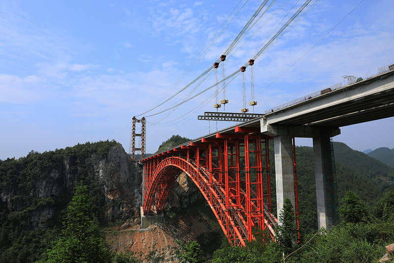 在建設(shè)過程中,項(xiàng)目技術(shù)人員進(jìn)行技術(shù)創(chuàng)新,確保施工質(zhì)量和安全。大橋采用“纜索吊機(jī)斜拉扣掛法”施工,根據(jù)地形條件,設(shè)計(jì)建造了兩個(gè)高65.2米和55.2米的纜塔,沒有風(fēng)纜,通過合理設(shè)計(jì)扣點(diǎn)和吊點(diǎn),確保大橋合龍精度;為降低施工安全風(fēng)險(xiǎn),在吊裝第7個(gè)節(jié)段時(shí)進(jìn)行提前封鉸,使大橋的“根”固定,減少擺動(dòng);找龍壩河特大橋拱上立柱是鋼結(jié)構(gòu),由外法蘭盤改成內(nèi)法蘭盤栓接后再外包鋼板焊接,使上下節(jié)段立柱成為整體,便于現(xiàn)場施工和線型控制,外形美觀。