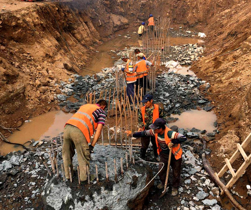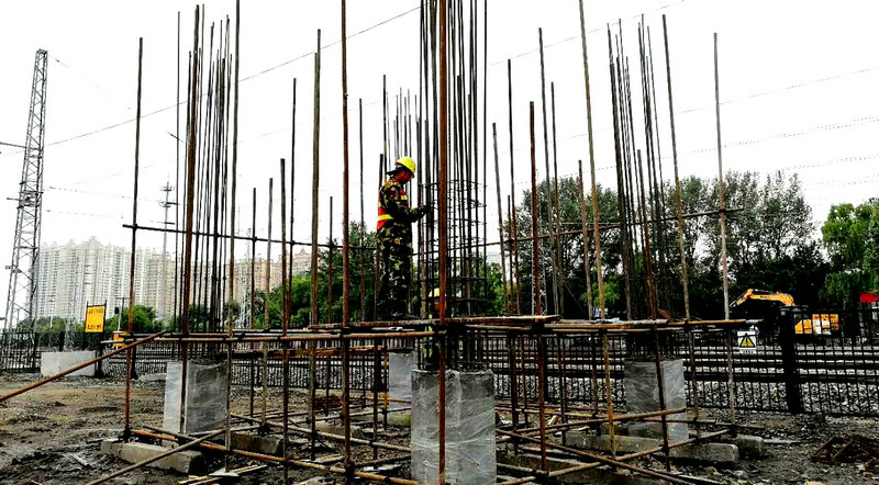 “咣當(dāng)、咣當(dāng)…”有節(jié)奏的鉆機(jī)轟鳴聲由遠(yuǎn)及近,濱綏線K128立交橋工地,工人們冒雨用砂袋對11號樁基進(jìn)行防護(hù),并清理河道淤泥,防止雨水倒灌。一字排開的5臺鉆機(jī)晝夜不停搶進(jìn)度。共產(chǎn)黨員、副經(jīng)理宮海濤欣喜地告訴筆者,目前5根樁基分別進(jìn)尺19.8米至16.9米不等,按期完成沒有問題。