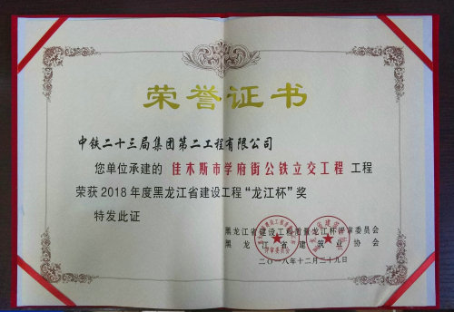 ?。ū揪W(wǎng)佳木斯訊)近日,由中鐵二十三局第二工程有限公司哈佳鐵路項(xiàng)目部承建的佳木斯市學(xué)府街公鐵立交工程榮獲黑龍江省工程質(zhì)量最高榮譽(yù)獎(jiǎng)項(xiàng)——黑龍江省優(yōu)質(zhì)工程建設(shè)“龍江杯”獎(jiǎng)。