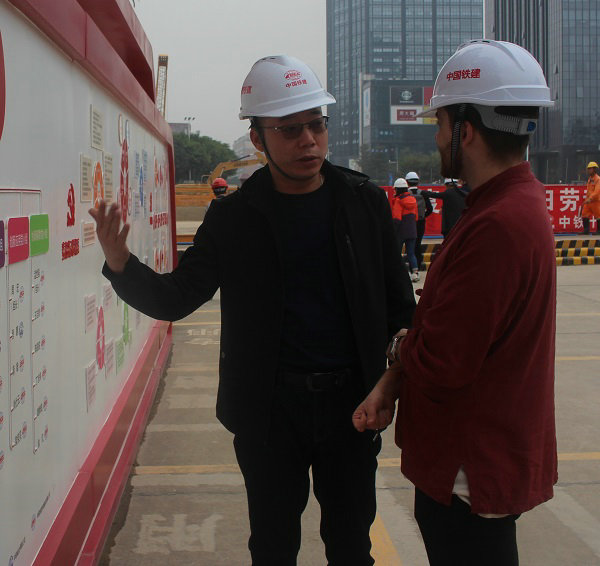 項(xiàng)目黨工委書記萬(wàn)子兵(左)向新華社廣東分社外國(guó)記者介紹黨建實(shí)踐基地情況