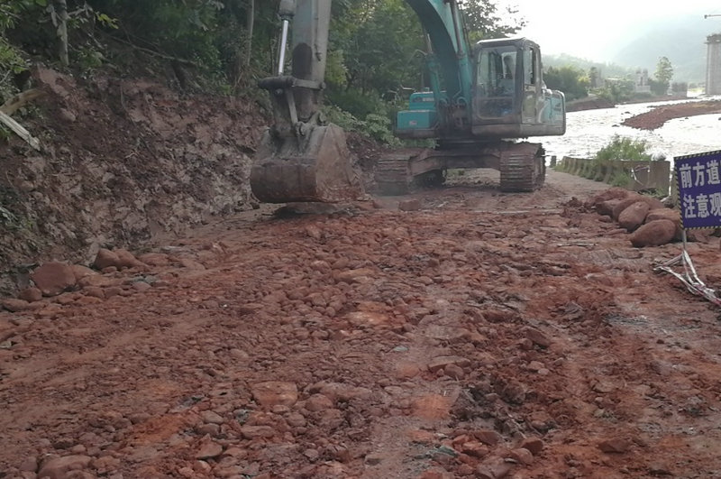 持續(xù)強降雨雨量達到200多毫米的屏山縣中都鎮(zhèn),中都河嚴重超出警戒水位,導(dǎo)致多地出現(xiàn)大面積山體滑坡、塌方、泥石流等自然災(zāi)害,中都河沿線道路多處垮塌,道路、電力、通訊一度中斷,部分農(nóng)田淹沒、許多村民受困。災(zāi)情就是命令,時間就是生命。項目部當機立斷,分工負責,從工區(qū)抽調(diào)20多人組成搶險突擊隊,出動大型挖掘機、裝載機各1臺迅速投入抗洪搶險。
