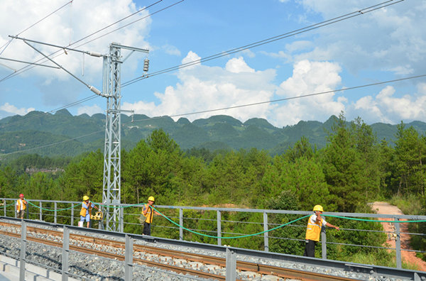 “今天施工任務是安裝吊弦,之后是對香樹坪大橋至大坪隧道懸掛調(diào)整。”從他口中得知,接觸線就是通過這個吊弦懸掛在承力索上,利用調(diào)節(jié)吊弦的長度來保證接觸線距軌面的高度,改善接觸懸掛的彈性,調(diào)整接觸線的弛度,以提高受電質(zhì)量。而為了保證接觸線的平順性,每一根吊弦的長度、安裝位置都不能有偏差,必須使吊弦各部件一次性安裝到位,這是至關(guān)重要的一道工序。