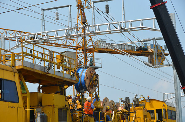 圖為:下午高溫時段,作業(yè)隊利用恒張力放線車進行接觸線架設(shè)施工。