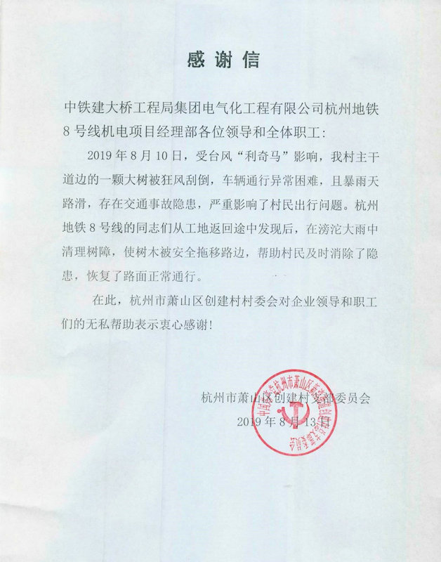 8月13日,中鐵建大橋局電氣化公司杭州地鐵8號線項目部收到杭州市蕭山區(qū)創(chuàng)建村的感謝信,表彰項目干部職工在超強臺風(fēng)“利奇馬”侵襲的關(guān)鍵時刻,用實際行動主動協(xié)助地方“抗臺風(fēng)”,幫助村民清除樹障,表示誠摯感謝。