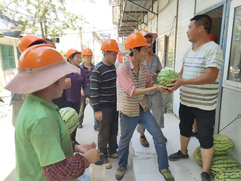 接到項(xiàng)目部送來的西瓜,農(nóng)民工們喜逐顏開