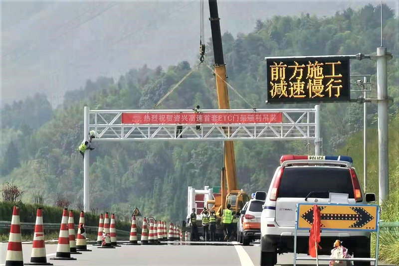 圖為廣西資興高速公路首個(gè)ETC門架吊裝施工