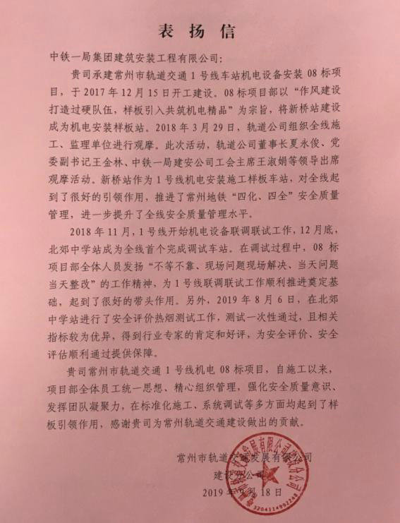 9月下旬,常州市軌道交通發(fā)展有限公司向中鐵一局建安公司常州地鐵1號線機電08標項目發(fā)來表揚信,對項目各項工作給予肯定,并提出表揚。