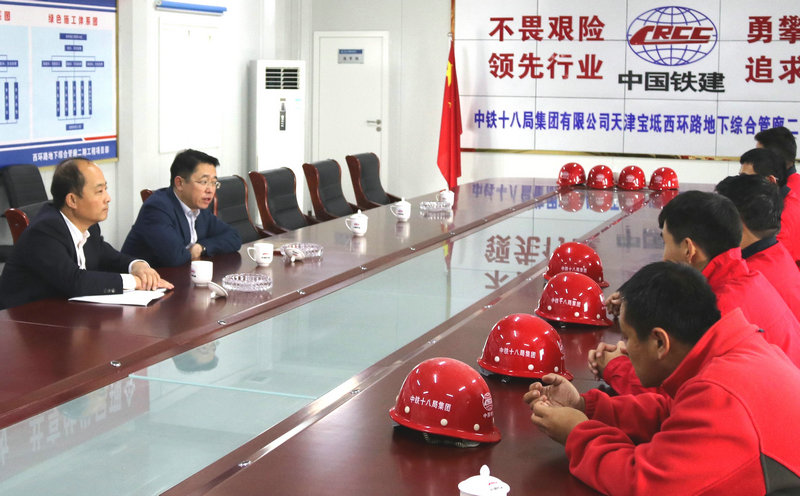 3、中鐵十八局集團三公司副總經(jīng)理兼津冀管理部經(jīng)理王海偉(左二)、寶坻管廊項目經(jīng)理李賢松(左一)在現(xiàn)場辦公(周文婷 伍振 攝)