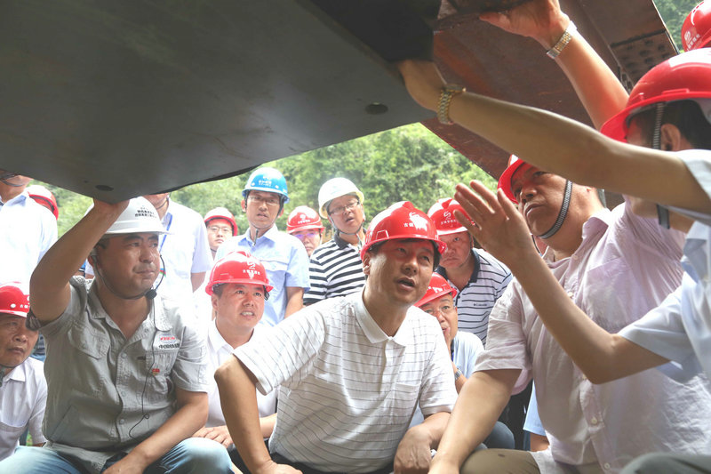 1、陜西省交通運輸廳副廳長黨延兵、陜西省交通設計院副院長馬保林在中鐵十八局集團二公司西鎮(zhèn)項目經(jīng)理周艇陪同下現(xiàn)場觀摩鋼梁支座安裝工藝(丁迪 攝)