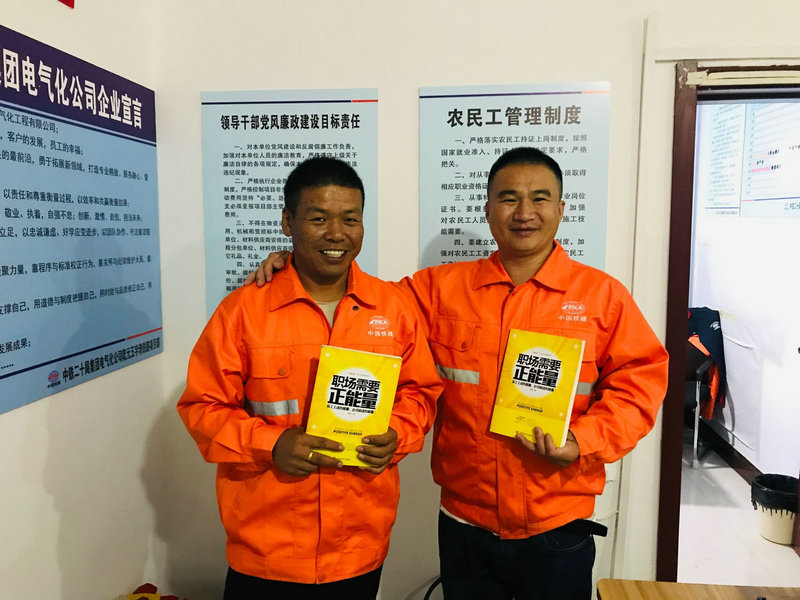 農(nóng)民工兄弟捧著贈(zèng)送的書籍喜悅地說(shuō),努力工作,為項(xiàng)目貢獻(xiàn)力量