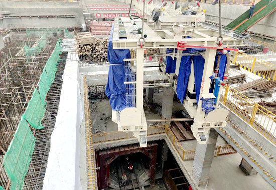 為保證設(shè)備有序進(jìn)場組裝,項目部積極組織加快九水東路站主體結(jié)構(gòu)施工,在TBM進(jìn)場前將前五段中板施工完成,保證前期組裝工作不受車站主體結(jié)構(gòu)施工影響。與此同時,TBM始發(fā)基座、反力架已經(jīng)提前下井,另對軌行區(qū)提前進(jìn)行清理,并鋪設(shè)軌道,讓電瓶車提前下井,保證臺車下井后,能立即放至指定區(qū)域組裝。此外,憑借6#TBM吊裝始發(fā)的經(jīng)驗(yàn),在5#TBM進(jìn)場前,項目部迅速將施工現(xiàn)場吊裝區(qū)清理出來,保證設(shè)備進(jìn)場不受場地問題制約。