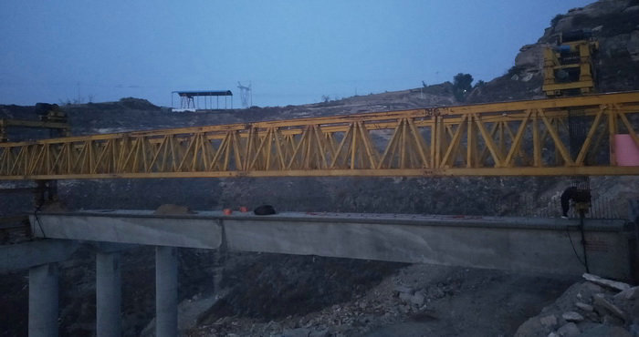 圖為首片箱梁架設(shè) 當(dāng)天架梁施工開始時(shí),40米長、重一百多噸的箱梁,經(jīng)過1個(gè)多小時(shí)的運(yùn)輸,第一片箱梁順利抵達(dá)寨峁大橋橋頭。早已等候在現(xiàn)場的架梁工人在架梁總指揮的統(tǒng)一指揮下,提梁、移梁、落梁等系列架梁工作隨即有序展開,在經(jīng)歷了3個(gè)多小時(shí)緊張有序工作后,第一片箱梁安全平穩(wěn)架設(shè)成功。