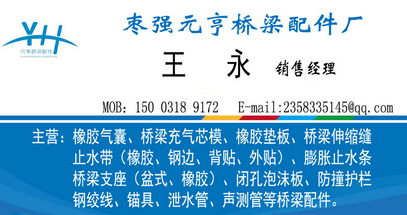 棗強元亨橋梁配件廠坐落于橡膠之鄉(xiāng)的河北衡水市,集研發(fā)、生產(chǎn)、銷售、咨詢和應用服務于一體的專業(yè)生產(chǎn)多用途氣囊容器產(chǎn)品的獨資企業(yè)。我廠擁有專業(yè)技術(shù)人員和專業(yè)機械設(shè)備及專業(yè)焊工隊伍。 我廠以專業(yè)的隊伍、嚴謹?shù)墓芾?、超卓的設(shè)備,專業(yè)生產(chǎn)質(zhì)量一流的橋梁配件。主營:橡膠氣囊,工程橡膠充氣芯模,高壓氣囊,橋梁橡膠充氣芯模,市政管道封堵氣囊,A級全膠氣囊,帶法蘭盤橡膠氣囊,帶拉手純膠氣囊,高速公路鐵路梁板氣囊,混凝土襯托芯模,隧道涵洞氣囊,邊溝芯膜,箱涵芯模,閉水實驗堵,閉氣試驗堵,試驗堵,橡膠護舷,封堵氣囊閉水堵,橡膠氣堵,充氣氣堵,充氣氣囊,橡膠氣囊布,排水管道堵水工具,管道用氣囊,橋梁板式支座,板式支座,橡膠膠板(厚度1mm-100mm),帶孔橡膠支座,橡膠止水帶,鋼邊止水帶,止水環(huán),止水條,接頭機,止水帶膠水,橋梁支座,橋梁伸縮裝置,閉孔泡沫板,雙組份聚硫密封膠(膏),護欄支架,聲測管,泄水管,鋼絞線,錨具等橋梁配件。