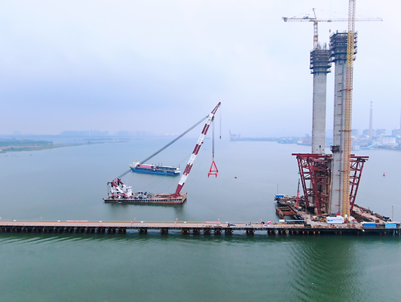 記者在現(xiàn)場(chǎng)看到,主橋目前已經(jīng)進(jìn)行主梁架設(shè)施工,但主塔還沒(méi)封頂。