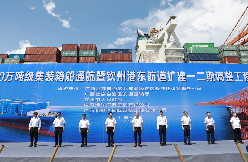 7月30日,由廣西北部灣辦、交通運(yùn)輸廳、欽州市人民政府、中遠(yuǎn)海運(yùn)集團(tuán)、北港集團(tuán)共同舉辦的“欽州港10萬(wàn)噸級(jí)集裝箱船通航暨欽州港東航道擴(kuò)建一二期調(diào)整工程開(kāi)工儀式”在廣西自貿(mào)試驗(yàn)區(qū)欽州港片區(qū)大欖坪南作業(yè)區(qū)隆重舉行。廣西壯族自治區(qū)副主席周紅波宣布——欽州港10萬(wàn)噸級(jí)集裝箱船通航,東航道擴(kuò)建調(diào)整工程開(kāi)工!