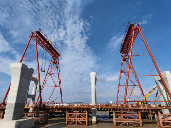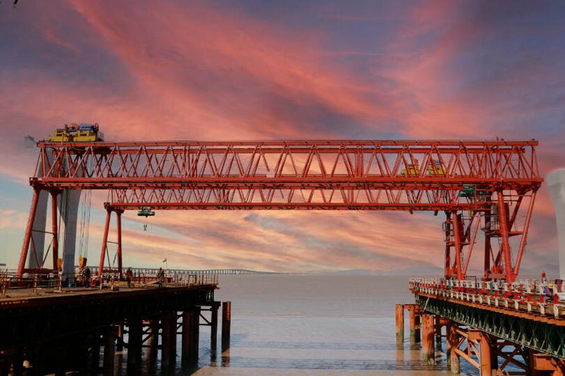 濱?;ネㄔO(shè)計(jì)142片鋼箱梁、299片疊合梁,單片重20—30噸、長(zhǎng)20—60米,架設(shè)好的30片梁,一部分是通過(guò)公路從舟山梁場(chǎng)運(yùn)至現(xiàn)場(chǎng),一部分是海上運(yùn)輸至石化區(qū)碼頭,轉(zhuǎn)運(yùn)至工地。由于梁體超長(zhǎng)超寬,公路運(yùn)輸安全風(fēng)險(xiǎn)大,租賃石化區(qū)碼頭卸梁再轉(zhuǎn)運(yùn),費(fèi)時(shí)費(fèi)力,影響進(jìn)度。該項(xiàng)目部從安全、效率、成本等多方面考慮,決定在互通區(qū)建1座卸梁站、2座提梁站。前期經(jīng)過(guò)實(shí)地勘察,確定了卸梁站和2座提梁站位置,組織人員編制出實(shí)施方案,經(jīng)多方專家評(píng)審?fù)ㄟ^(guò),報(bào)業(yè)主、鎮(zhèn)海區(qū)海事處審批后付諸實(shí)施。在聯(lián)系聯(lián)系廠家加工龍門吊的同時(shí),組織力量拆除區(qū)域內(nèi)的棧橋,深挖卸梁站航道內(nèi)的淤泥,克服多種困難,于7月13日建成36,4米高、16,8米寬的卸梁站。在兩座提梁站建設(shè)中,該項(xiàng)目部戰(zhàn)勝高溫、大風(fēng)大雨等極端天氣造成的困難,8月初建成1號(hào)提梁站并通過(guò)有關(guān)方面驗(yàn)收。在2號(hào)提梁站施工中,遭遇兩次強(qiáng)臺(tái)風(fēng),施工受阻,項(xiàng)目部采取科技公關(guān)、優(yōu)化資源等舉措,將臺(tái)風(fēng)造成的損失奪了回來(lái),如期建成74米長(zhǎng)、36米高、15米寬、負(fù)荷200噸的2號(hào)提梁站。兩座提梁站和1座卸梁站使用鋼材250余噸。