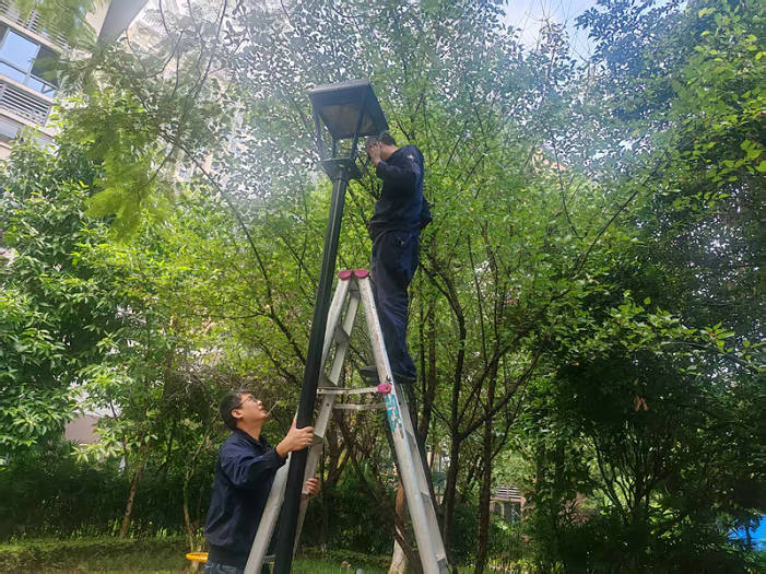 夜幕降臨時,他們化身“光亮守護者”穿梭于樹叢樓宇間。搭梯登高檢修路燈線路、手持加長工具清潔燈罩、加固燈桿、排查線路、更換燈泡、調(diào)試亮度,每一個步驟都一絲不茍。維修員們用專業(yè)操作確保每一盞路燈準時亮起,為居民夜間出行鋪就安全通道。