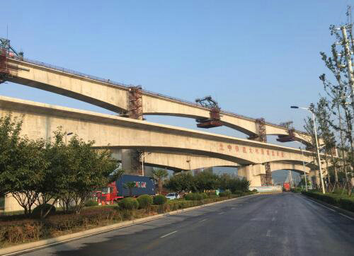 本次合龍的北端下行聯(lián)絡(luò)線特大橋60+2*100+60米現(xiàn)澆預(yù)應(yīng)力砼連續(xù)梁全橋長321.5m,橋?qū)?.4m,為標(biāo)段內(nèi)跨度最大的單線連續(xù)梁。項(xiàng)目管段內(nèi)共有8聯(lián)連續(xù)梁屬于鄰近營業(yè)線施工,并行線路多,鄰近營業(yè)線施工區(qū)間平行分布4條鐵路,從左側(cè)向右側(cè)依次為商合杭鐵路正線、北端下行聯(lián)絡(luò)線、合福高鐵、北端上行聯(lián)絡(luò)線,梁緣距合福線翼緣板水平距離最近處僅為4.77米,新建連續(xù)梁最高墩達(dá)37米(相當(dāng)于12層樓高),此外還跨越公路等,施工作業(yè)區(qū)相當(dāng)狹窄,安全風(fēng)險(xiǎn)極大,施工中稍有不慎,就會(huì)造成極其嚴(yán)重交通堵塞甚至危急行車安全,這種復(fù)雜的施工條件在國內(nèi)尚無施工經(jīng)驗(yàn)可供借鑒。如此環(huán)境施工被形象地比喻成“在刀尖上跳舞”。