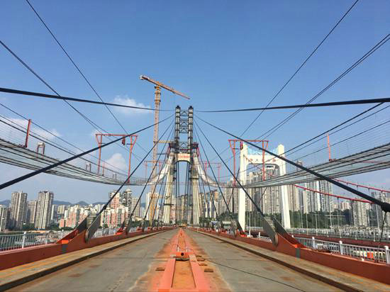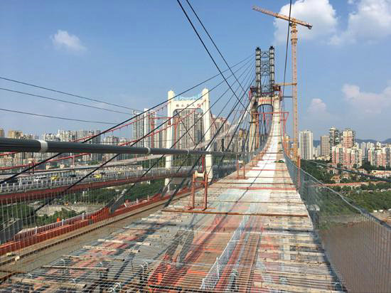 該橋每束索股長(zhǎng)約1065米,重約23.4噸。每束索股由127根直徑為5.3毫米高強(qiáng)鋼絲組成,索股用定型捆扎帶綁扎而成,斷面為正六邊形,兩端設(shè)熱鑄錨頭,全橋共兩根主纜,每根主纜由92束索股組成。