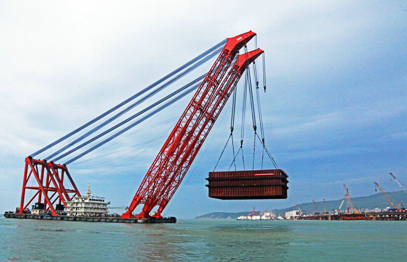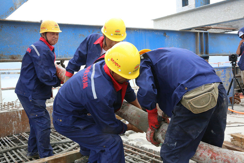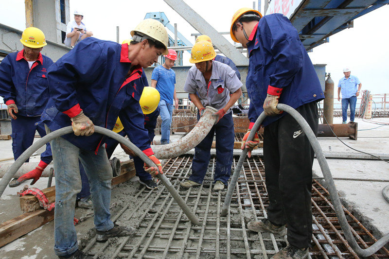 “鐵建砼01”攪拌船通過(guò)兩個(gè)42米長(zhǎng)的輸送泵將混凝土輸送到鋼筋模板內(nèi)部
