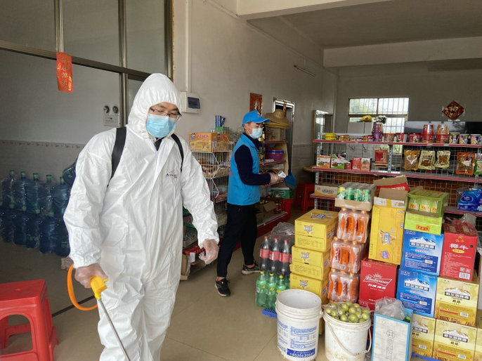 由項(xiàng)目團(tuán)青年組成的疫情防控志愿者服務(wù)隊(duì)整裝待發(fā),在與當(dāng)?shù)厣鐓^(qū)取得聯(lián)系后,籌備了一次性口罩、一次性手套等防疫物資分發(fā)到社區(qū)的每個執(zhí)勤崗位上,并有序組織志愿者為當(dāng)?shù)厣鐓^(qū)人員活動密集場所進(jìn)行消毒。