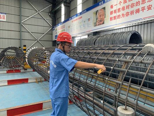 每天總是先人一步到達(dá)鋼筋加工廠,檢查施工人員防護(hù)用具是否佩戴齊全,對(duì)不按要求佩戴防護(hù)用具的工人,進(jìn)行耐心的安全教育,并要求工人必須將防護(hù)用具佩戴齊全后,才能上崗作業(yè)。在對(duì)全自動(dòng)滾籠機(jī)的模具進(jìn)行校正,總是時(shí)不時(shí)沾到油污,但是從不抱怨,只有身上搞臟了,流汗了,才說明真的把心放在現(xiàn)場(chǎng)施工中。
