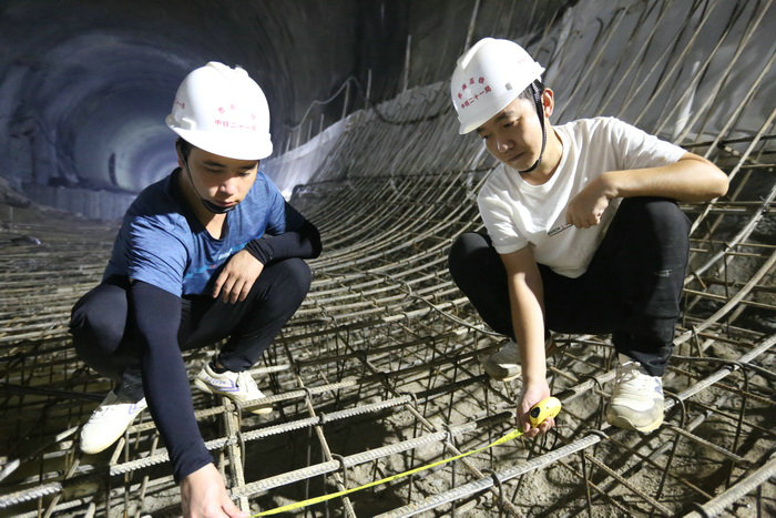 李敏(右)與技術(shù)員吳亞明在白秀山2#隧道檢查仰拱鋼筋間距隧道里架橋,是貴南高鐵施工的一大奇觀,體現(xiàn)了中國鐵建員工高超的智慧和靈感。在世界上享有基建狂魔的中國,絕不是吹牛,而是靠實(shí)干干出來的。