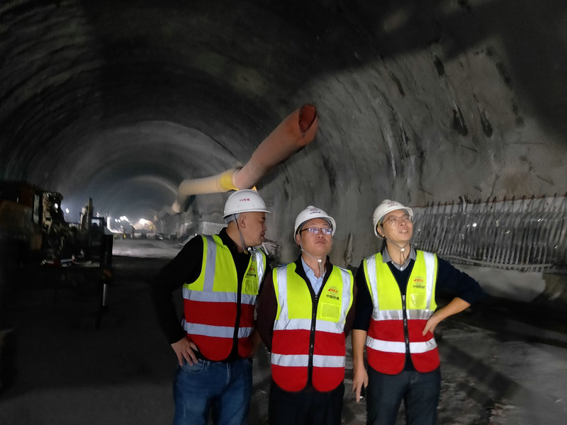項(xiàng)目黨支部書記何偉(中)與經(jīng)理曹元均(左)在中梁山隧道進(jìn)口進(jìn)行“安全夜查”