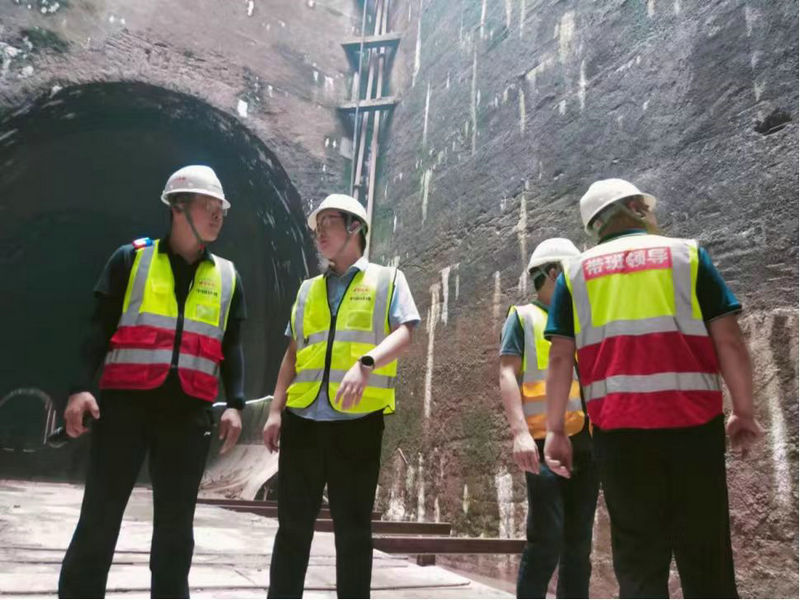 項(xiàng)目總工程師李文慶(左二)與項(xiàng)目經(jīng)理阮超(左一)等相關(guān)領(lǐng)導(dǎo)進(jìn)行隧道施工月度綜合檢查