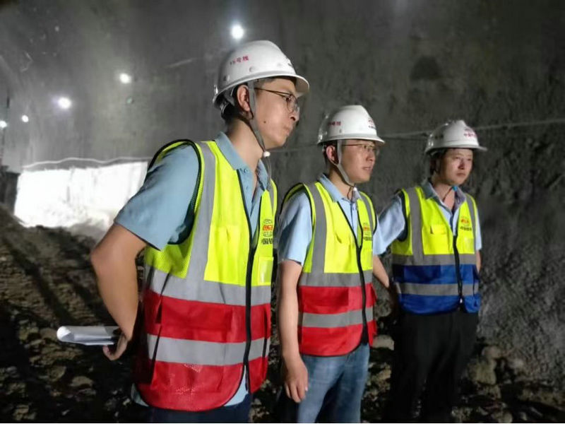 牛浩(右一)陪同項(xiàng)目經(jīng)理阮超(中)在中梁山隧道進(jìn)口掌子面進(jìn)行質(zhì)量檢查