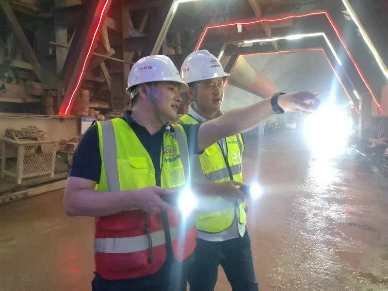 牛浩(右)陪同項(xiàng)目書(shū)記韓崇生(左)在中梁山隧道進(jìn)口進(jìn)行質(zhì)量檢查
