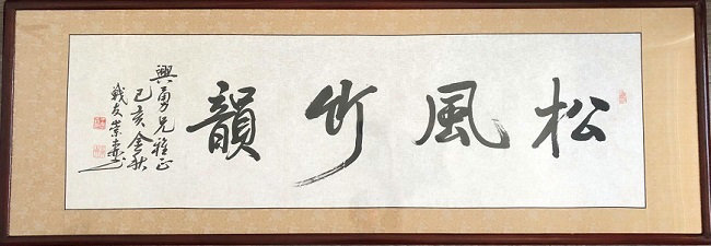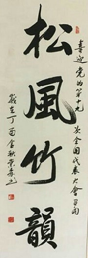 應(yīng)該說王崇森戰(zhàn)友的這禎“松風竹韻”書法作品是我倆結(jié)緣的伊始。2017年10月初,我是在微信《政友群》中看到王崇森戰(zhàn)友曬出的這幅作品,這禎書法是其參加中鐵十五局集團公司工會、老年體協(xié)舉辦的“迎接黨的十九大召開、慶祝建軍90周年”老年職工書畫、攝影作品展上的獲獎作品。我一看到這幅書法作品就非常的欣賞與喜愛,尤其是書法作品中四個字的詞意也很適合時宜。當時我就有點心血來潮地隨即用“松風竹韻”四字為題寫了首藏頭詩發(fā)在微信群中表示點贊與恭賀。