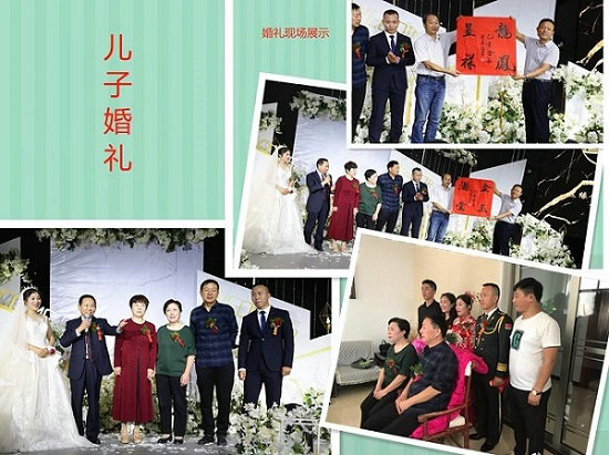 同時帶來的還有“情滿天山”豎向書法一禎,當劉合坤戰(zhàn)友展開作品時,我是非常的興奮與喜悅,自然心情激動,立馬浮現(xiàn)出在新疆天山參建南疆鐵路的場景。真可謂是心有靈犀,我也曾在2012年寫過《難忘天山歲月》的文稿,同時刊登在《鐵道兵戰(zhàn)友網(wǎng)》《中國鐵路工程建設(shè)網(wǎng)》。看到這幅精美的書法作品與詞意,自然會激起我想起曾在天山深處的那段難忘歲月。也正是因為有了那五年多在施工連隊的艱苦歷練,才讓我養(yǎng)成了無論施工有多累、有多忙,每天都要擠出兩小時左右來系統(tǒng)地讀書學習,堅持一星期要寫一篇《每周一文》,直到現(xiàn)在我還保持著這個習慣。兵改工后,我被單位推薦外送地方中醫(yī)院校進修學習并考取中醫(yī)師資格證,由此才改變了我的職業(yè)生涯。之后的三十多年,除了喜愛讀書的習慣沒變外,在企業(yè)的幾次改制中也兼職過幾種其它工作,直到退休仍然是保持原地踏步,初心未改。2019年9月26日,是我兒子結(jié)婚的慶典日期,原本著婚事從簡,不擾動過多的親戚朋友、同學、戰(zhàn)友。王崇森戰(zhàn)友可能是從合坤戰(zhàn)友處得知的這個信息,于是寫好了這兩禎喜慶的墨寶讓合坤戰(zhàn)友帶到了婚禮現(xiàn)場,在婚慶主持人的策劃下,由劉合坤和郭圣柏兩戰(zhàn)友在婚禮現(xiàn)場進行展示。這一別開生面的婚慶程序安排,即刻將婚禮現(xiàn)場推向了歡樂喜慶的高潮,也展現(xiàn)出了我們鐵道兵人的文化底蘊與特色創(chuàng)意,受到了婚慶現(xiàn)場眾多親朋好友與戰(zhàn)友們的共同好評與點贊。在此我再一次的向王崇森老戰(zhàn)友,劉合坤戰(zhàn)友,郭圣柏戰(zhàn)友表示衷心的感謝!
