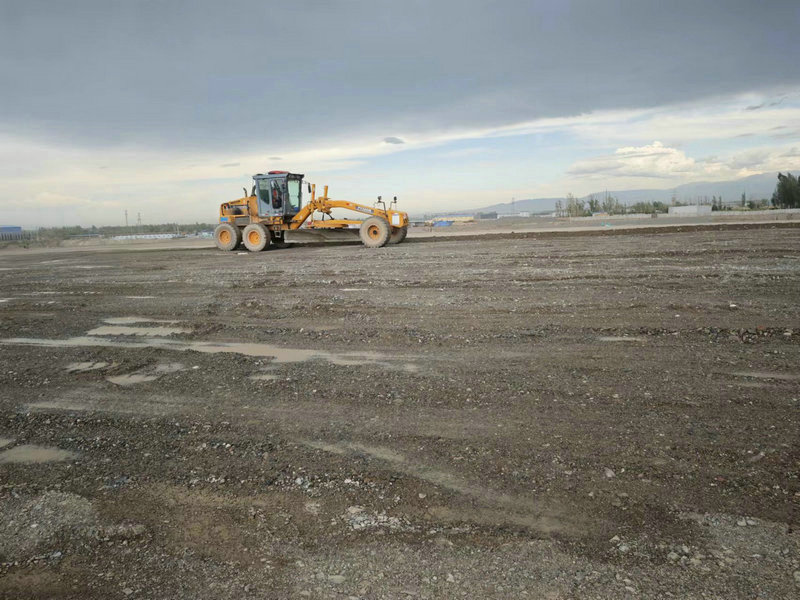 圖為新疆兵團(tuán)建工水電集團(tuán)市政路橋公司第五師雙河市G577沙山子-G219線公路(互通立交工程)RAK0+960-RAK0+800平地機整平。(王小丫 攝)